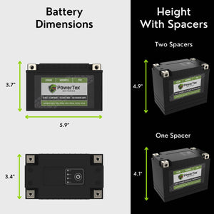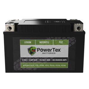 Upgrade your ride with the Powertex PTX2 Lithium Powersport Battery, the ultimate replacement for traditional lead-acid batteries. This advanced lithium iron phosphate (LiFePO4) battery features four terminals for flexible installation in any position and includes universal spacers to ensure compatibility with YTX7A-BS, YTX9-BS, YTZ10S, YT12A-BS, YTZ12S & YTZ14S models. Perfect for motorcycles, ATVs, UTVs, snowmobiles, scooters, and more, it combines cutting-edge technology with unparalleled versatility.